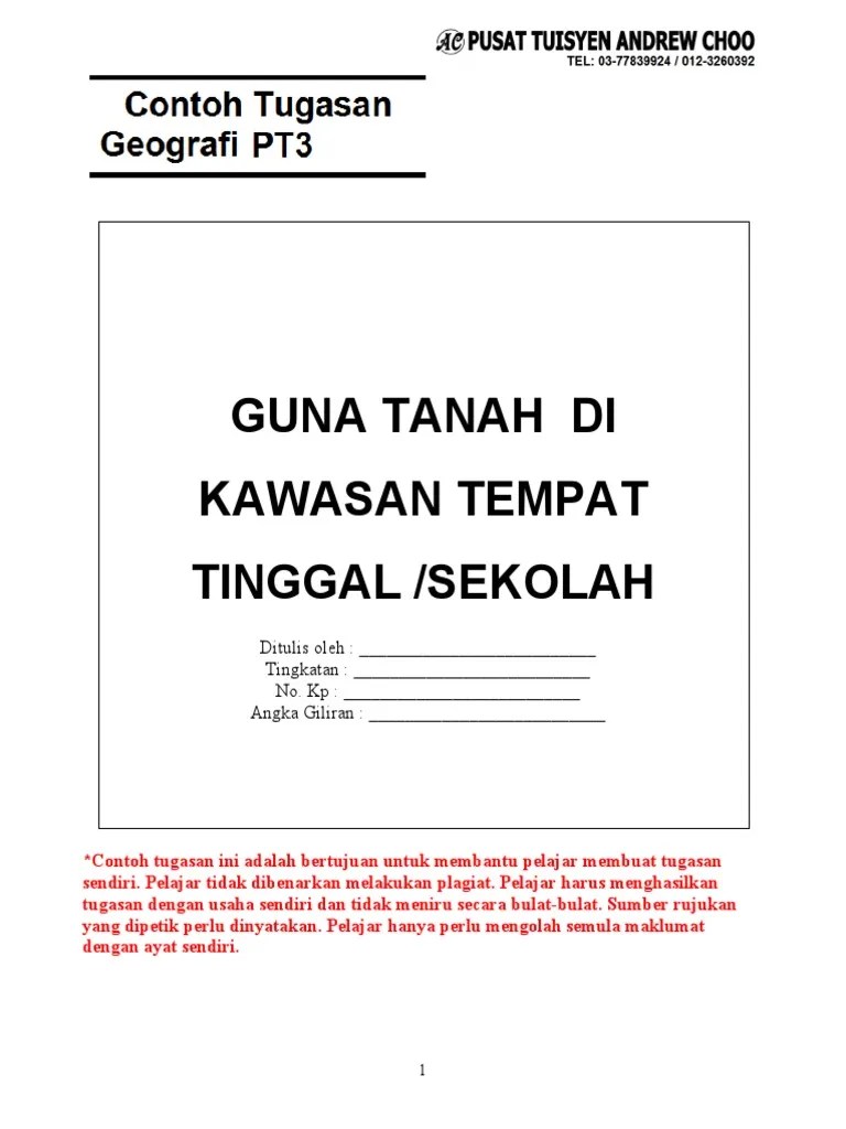 3 from Tajuk kerja kursus geografi pt3 2018 (kajian guna tanah). Tips, contoh dan panduan jawapan kerja kursus pt3 geografi 2018 kajian guna tanah. Contoh tugasan folio kerja kursus geografi pt3 2021 tingkatan 3: Calon dikehendaki menjalankan kajian tentang guna tanah di kawasan tempat tinggal atau sekolah anda. Beliau telah meluangkan banyak masa dalam memberi tunjuk ajar dan membimbing saya untuk menyempurnakan kerja kursus ini. Maklumlah, guru sekolah andalah yang menyemak dan memberi markah kepada tugasan anda. Berikut adalah contoh kerja kursus geografi pt3 sistem pengangkutan yang dapat dijadikan panduan dan rujukan kepada pelajar semua menyiapkan. Kerja kursus geografi pt3 2018 tingkatan 3: