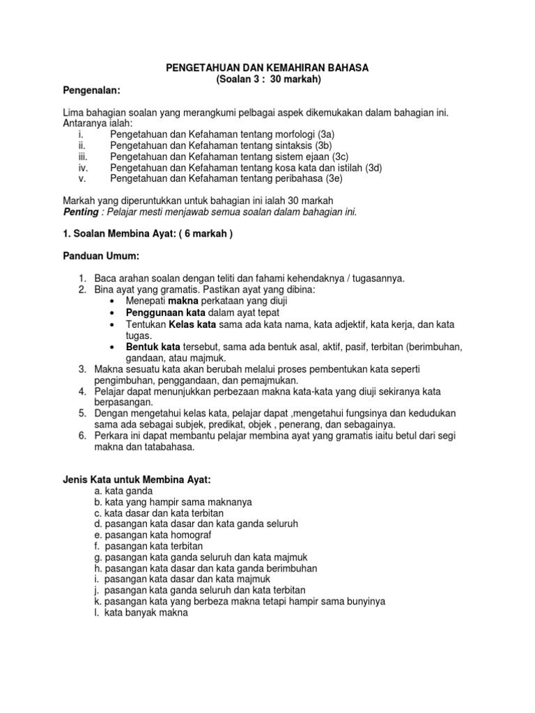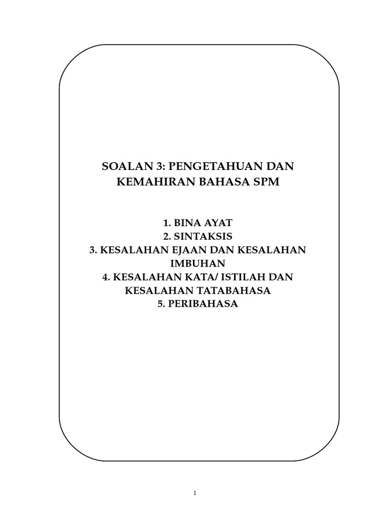 Soalan 3 iaitu pengetahuan & kemahiran bahasa dalam kertas 2. (d) membetulkan satu kesalahan penggunaan kata atau istilah dan satu kesalahan tatabahasa dalam ayat. Pengetahuan, pengalaman dan kemahiran yang secukupnya sebagai persediaan untuk mereka menyertai masyarakat moden. Mukadimah• terdapat dua komponen asas dalam kemahiran lisan yang berhubung dengan kemahiran bahasa iaitu : Penguasaan bahasa inggeris yang lemah merupakan antara lima faktor utama yang mempengaruhi kesukaran graduan mendapatkan pekerjaan.