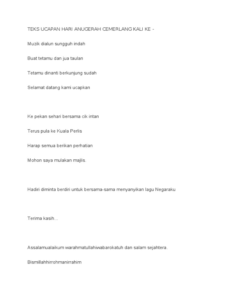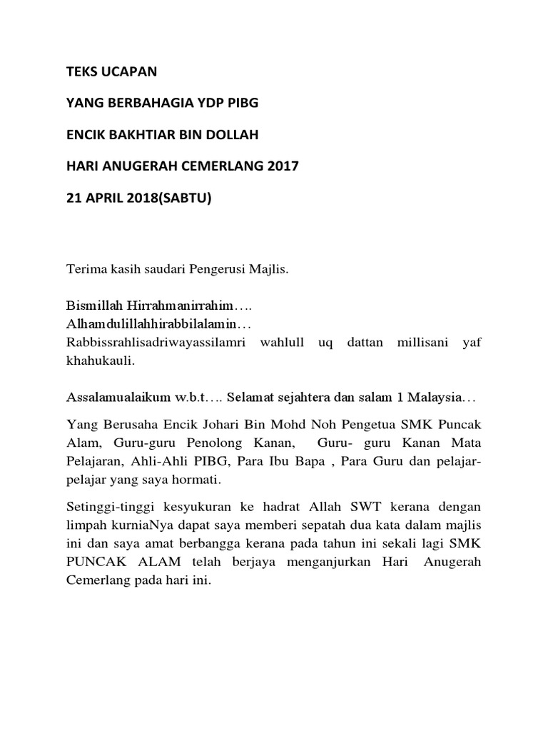 Teks pengacara majlis anugerah kecemerlangan smk kampong jawa. Download as doc, pdf, txt or read online from scribd. Teks ucapan perasmian hari anugerah kecemerlangan. Anugerah di mulakan dengan anugerah kepimpinan cemerlang. Draf ucapan perasmian majlis anugerah cemerlang dan mesyuarat agung pibg smk cheras jaya tahun 2009.